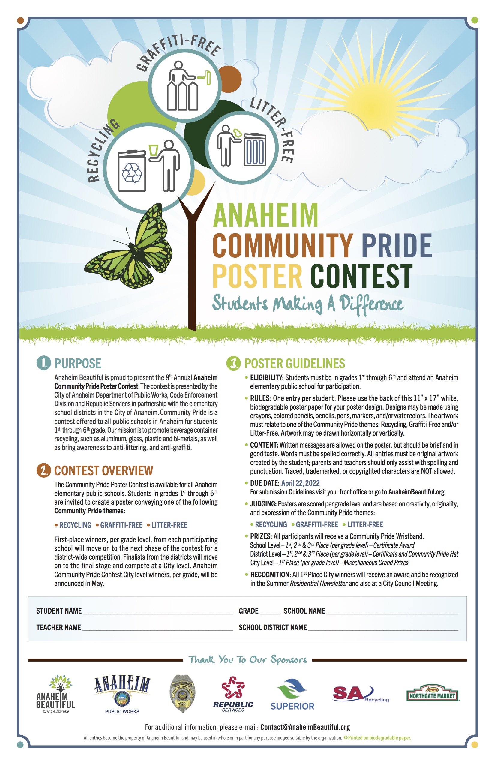 CommunityPridePosterContestLogoFormerly known as Green Ribbon Week, the Anaheim Beautiful Community Pride Poster Contest is offered each Spring and reaches well over 32,000 young minds. In cooperation with the program sponsors and the Anaheim Elementary School District, Magnolia School District and Orange Unified School District, the contest encourages students to partake and develop an attitude of pride for their community by focusing on being litter-free, graffiti-free and recycling. Winners are selected at the school, district and City level. The final six winners, one from each grade, are recognized by the Anaheim City Council at their first meeting in June and receive a special grand prize.
